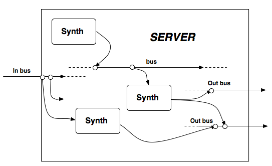 On the server external signals can be received by synths from "public" input busses (one in the represented case), while the different synths must be connected to "public" out audio busses (two in the case) in order to output a signal externally to the soundcard (see Bus). Other busses (both control and audio) are internal. In general, busses can be thought as roughly analogous to sends, busses, or submixes on an analog mixer, or as pipes allowing one to route "flowing" signals. If a synth is connected to a bus at a certain point (thus "flowing" into it) a synth taking the signal from the same bus at a subsequent point will take as input the flowing signal (along with anything else previously output to the bus), just as would occur with a water pipe.