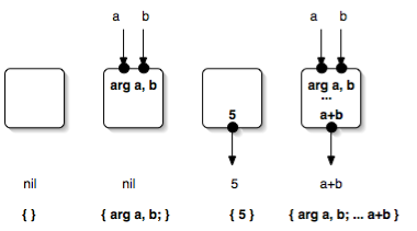 A function can be thought as a machine able to perform a task on demand, e.g. a calculator. The calculator can receive input (args) and can output a value, the result of the performed operations. The function definition can then be thought as the building of the calculator: once built, the calculator does nothing until it is requested to work (by passing the value method to a function). The following figure depicts an empty function, input without output, output without input, and the general case with input and output.