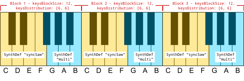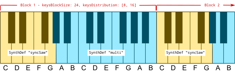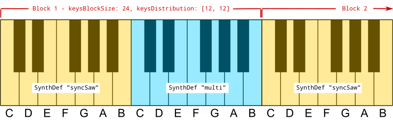 As you may already have recognized you can use more than one SynthDef on one physical keyboard. When doing so by calling -setSynthDef with more than one SynthDef the keys are being equally distributed over a predefined block of keys (by default 24 keys or two octaves). The blocks will repeat over the full range of 128 MIDI notes, beginning at MIDI note 0. Here are some schematic examples using two SynthDefs on a three-octaves keyboard1 :